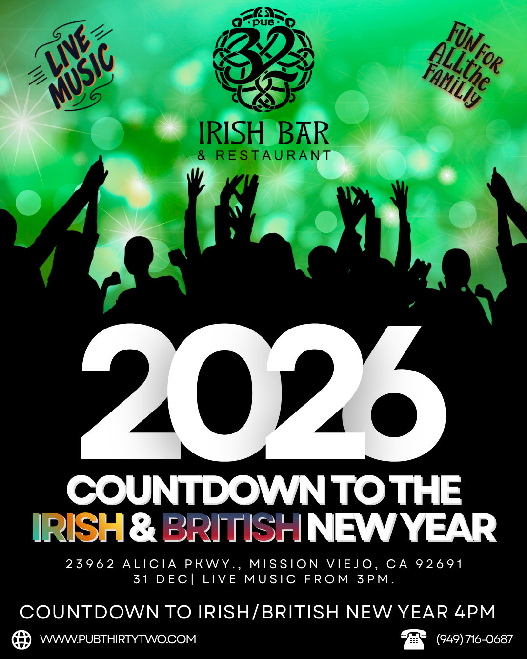 Celebrate the arrival of 2026 with a unique twist this New Year's Eve at Pub Thirty-Two! Join us on December 31st, 2025, for an unforgettable Irish & British New Year Countdown that lets you ring in the New Year early—perfect for families and night owls alike.
